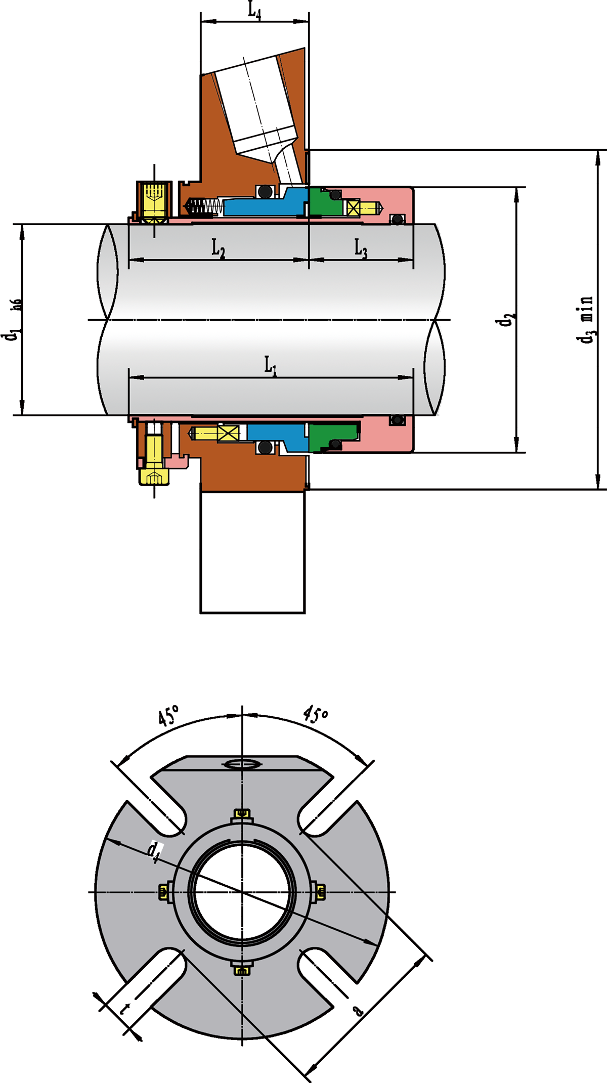 动环(Rotary Ring): Q1,Q2,A 静环(Seat Ring): Q1,Q2,A 辅助密封(Secondary Seal):V,K,M1,M2 弹簧及结构件(Spring and Metal Parts):G,M